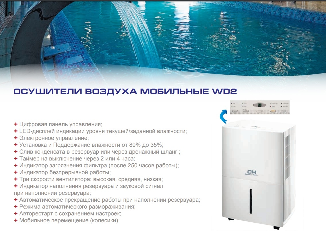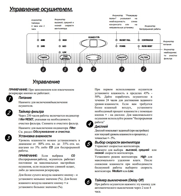 Цифровой дисплей. Автоматическая регулировка влажности от 80% до 35%. Производительность 16 л/сутки или 0,7 л/час. Функция сохранения параметров.Слив конденсата в резервуа р или через дренажный шланг